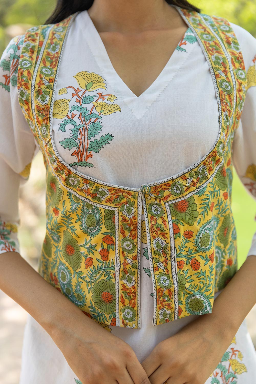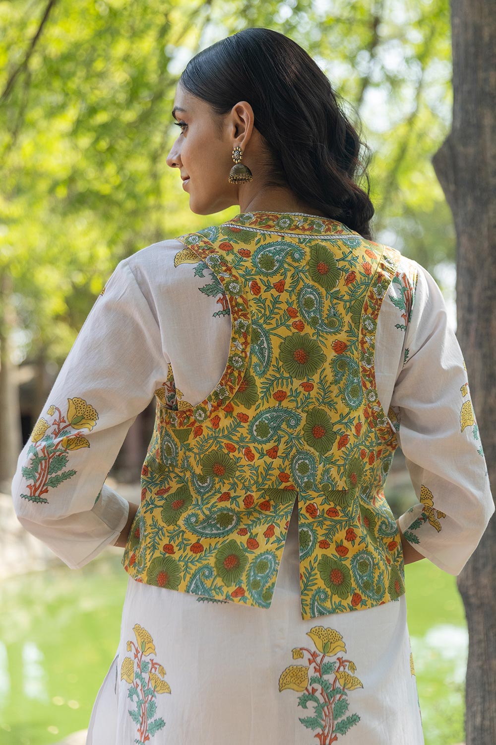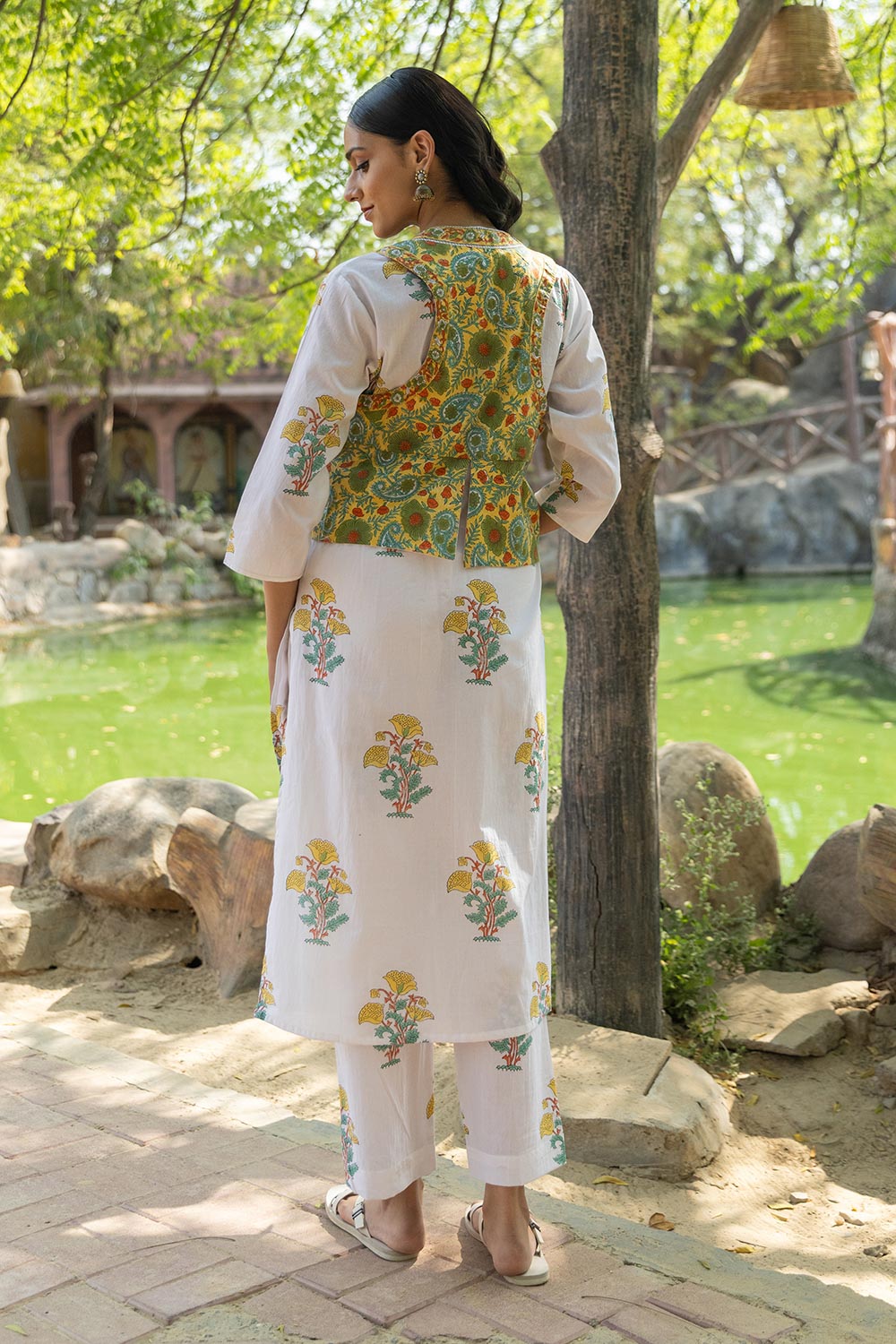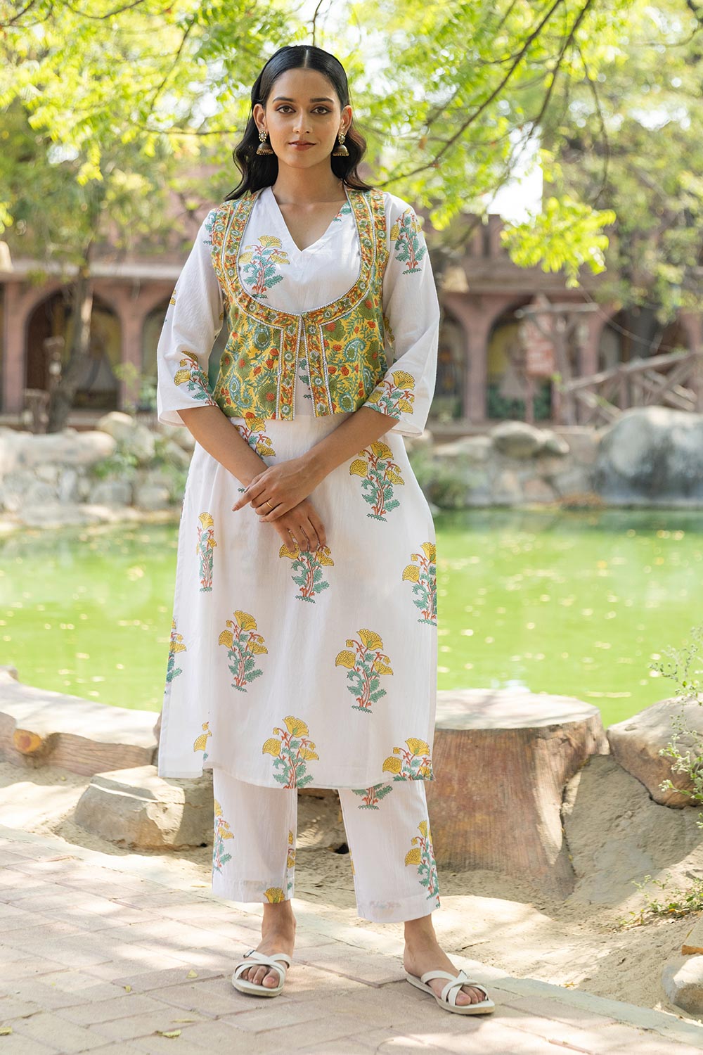 White Boota Co-ord Set With Contrast Dark Jacket - Elegant Indian Fusion Outfit